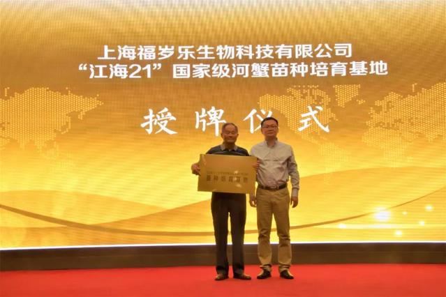 会上,郏成洋局长向上海福岁乐生物科技有限公司授牌《“江海21”国家级河蟹良种兴化生产基地》,上海海洋大学水产与生命学院副院长陈再忠向兴东水产养殖专业合作社授牌《“江海21”国家级河蟹苗种培育基地》。