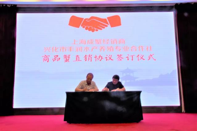 同时,成蟹经销商上海赵俊滨先生与兴化市丰润水产养殖专业合作社理事长宗耕艮签订商品蟹直销协议、上海福岁乐生物科技有限公司与兴东水产养殖专业合作社签订苗种培育合作协议。
