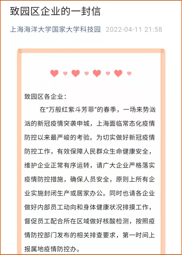 他说“在封控期间一线抗疫工作量更大了,如果相应的人力没有跟上,那么工作开展起来会困难重重,我想尽我所能,为抗疫贡献自己的力量,上海疫情确实给大家的生活带来很多不便,但是我们一起抗过疫,一起‘打过仗’,“同心战疫,海大科技园在行动”,面对疫情,园区从不缺位;面对困难,园区从不畏惧”。
