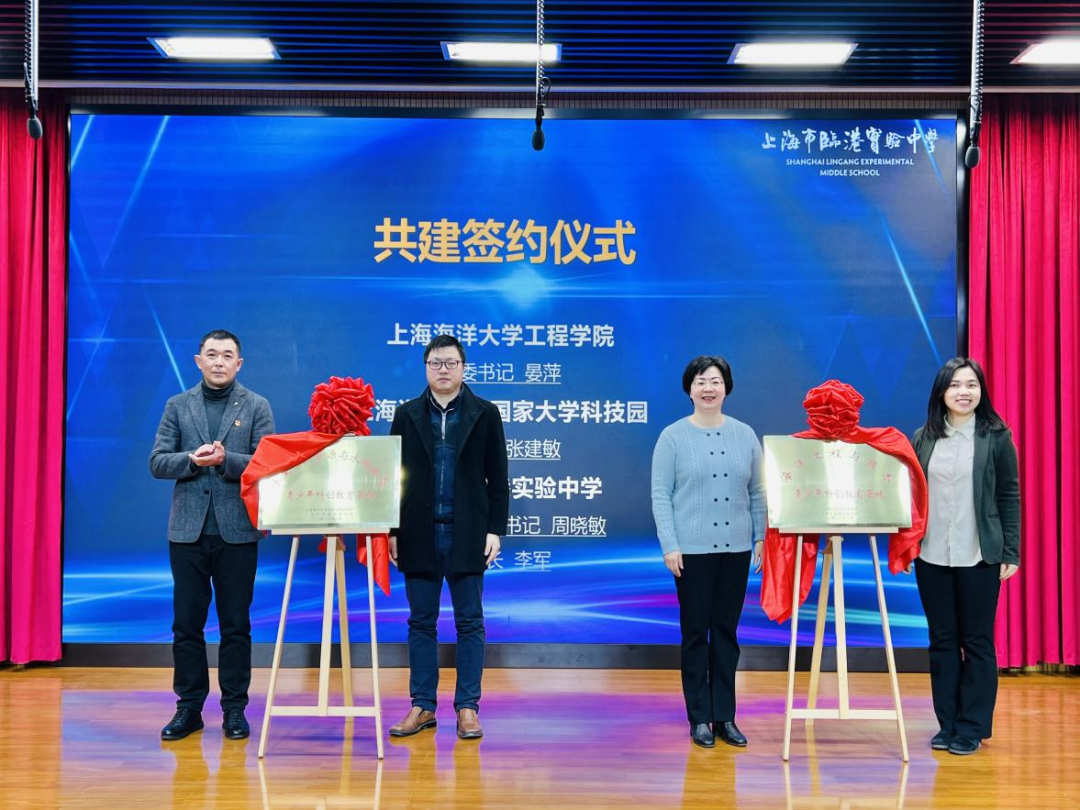 2月27日,上海市临港实验中学科技节开幕式顺利召开,仪式上,园区总经理张建敏、上海海洋大学工程学院党委书记晏萍、上海市临港实验中学校长、党支部书记周晓敏、副校长李军共同为共建基地揭牌。
